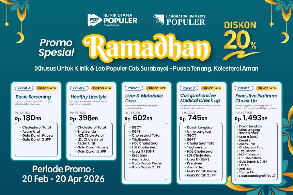 Dalam rangka menyambut bulan suci Ramadhan 2026, Klinik Utama Populer dan Laboratorium Medis Populer menghadirkan Promo Spesial Ramadhan dengan Diskon 20% untuk berbagai paket pemeriksaan kesehatan. Promo ini dirancang untuk membantu masyarakat menjaga kondisi tubuh tetap prima selama menjalani ibadah puasa. β οΈ Promo ini hanya berlaku untuk Cabang Surabaya. π Periode Promo: 20 Februari β 20 April 2026 π Tagline: Puasa Tenang, Kolesterol Aman Mengapa Perlu Cek Kesehatan Saat Ramadhan? Perubahan pola makan dan jam istirahat selama puasa dapat memengaruhi kondisi tubuh, terutama bagi Anda yang memiliki faktor risiko seperti: Kolesterol tinggi Asam urat Gangguan gula darah Masalah fungsi hati dan ginjal Melalui pemeriksaan laboratorium dan Medical Check Up (MCU), kondisi kesehatan dapat dipantau lebih dini sehingga ibadah tetap lancar dan nyaman. π Daftar Paket & Rincian Pemeriksaan Berikut rincian lengkap paket promo beserta harga setelah diskon 20%: π©Ί Paket A β Basic Screening Harga Promo: Rp 180.000 (Normal Rp 224.000) Cocok untuk skrining awal kesehatan dasar. Pemeriksaan meliputi: Cholesterol Total Asam Urat Gula Darah Puasa Gula Darah 2 Jam Post Prandial (2 JPP) π©Ί Paket B β Healthy Lifestyle Harga Promo: Rp 398.000 (Normal Rp 497.000) Ideal untuk pemantauan profil lemak dan risiko metabolik. Pemeriksaan meliputi: Cholesterol Total Trigliserida HDL Cholesterol LDL Cholesterol Asam Urat Gula Darah Puasa Gula Darah 2 JPP π©Ί Paket C β Liver & Metabolic Care Harga Promo: Rp 602.000 (Normal Rp 753.000) Fokus pada fungsi hati, ginjal, dan metabolisme tubuh. Pemeriksaan meliputi: SGOT SGPT Cholesterol Total Trigliserida HDL Cholesterol LDL Cholesterol Urea N (BUN) Kreatinin Asam Urat Gula Darah Puasa Gula Darah 2 JPP π©Ί Paket D β Comprehensive Medical Check Up Harga Promo: Rp 745.000 (Normal Rp 932.000) Pemeriksaan menyeluruh untuk evaluasi kesehatan rutin tahunan. Pemeriksaan meliputi: Darah Lengkap Urine Lengkap SGOT SGPT Cholesterol Total Trigliserida HDL Cholesterol LDL Cholesterol Urea N (BUN) Kreatinin Asam Urat Gula Darah Puasa Gula Darah 2 JPP π©Ί Paket E β Executive Platinum Check Up Harga Promo: Rp 1.493.000 (Normal Rp 1.867.500) Paket pemeriksaan lengkap termasuk skrining jantung dan hepatitis. Cocok untuk kebutuhan MCU perusahaan maupun pemeriksaan eksekutif. Pemeriksaan meliputi: Darah Lengkap Urine Lengkap SGOT & SGPT Urea N (BUN) Kreatinin Asam Urat Cholesterol Total Trigliserida HDL Cholesterol LDL Cholesterol Gula Darah Puasa & 2 JPP HBsAg Anti HBs Thorax PA Electrocardiografi (ECG) π Tabel Pricelist Promo Ramadhan 2026 Paket Nama Paket Harga Normal Harga Promo (Diskon 20%) A Basic Screening Rp 224.000 Rp 180.000 B Healthy Lifestyle Rp 497.000 Rp 398.000 C Liver & Metabolic Care Rp 753.000 Rp 602.000 D Comprehensive MCU Rp 932.000 Rp 745.000 E Executive Platinum MCU Rp 1.867.500 Rp 1.493.000 π Lokasi & Ketentuan β Promo hanya berlaku di Cabang Surabaya β Berlaku selama periode 20 Februari β 20 April 2026 β Tidak dapat digabung dengan promo lainnya β Disarankan reservasi terlebih dahulu Yuk, Jaga Kesehatan di Bulan Penuh Berkah Ramadhan adalah momen memperbaiki diri secara menyeluruh. Jangan hanya fokus pada ibadah, tetapi juga pada kesehatan tubuh. Dengan pemeriksaan yang tepat, Anda dapat menjalani puasa dengan lebih nyaman dan aman. π Puasa Tenang, Kolesterol Aman Segera reservasi dan manfaatkan promo sebelum periode berakhir.